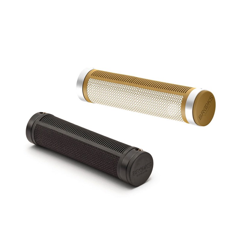 These comfortable bike grips are ergonomically designed for straight, swept and riser handlebars. Genuine, supple Brooks leather has been fused with an ergonomic rubber base for exceptional comfort and a delicate touch. Fastened by aluminium handlebar end clasps, in satin silver or copper-coloured finish.