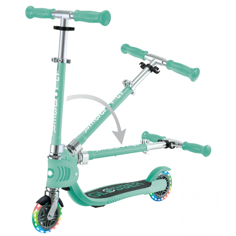 • 適合 3 歲以上兒童的可摺式 2 輪滑板車,配備 Globber 一體化摺疊系統,設有安全易用的按鈕,可輕鬆摺疊、攜帶及收納。
