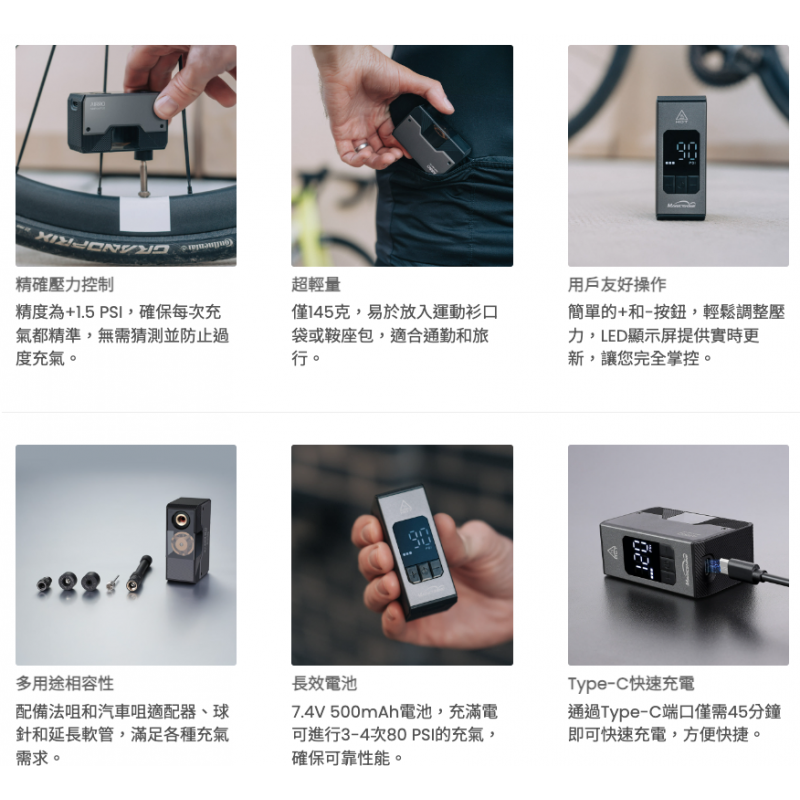 ✔️7.4V 500mAh電池,充滿電可進行3-4次80 PSI的充氣。