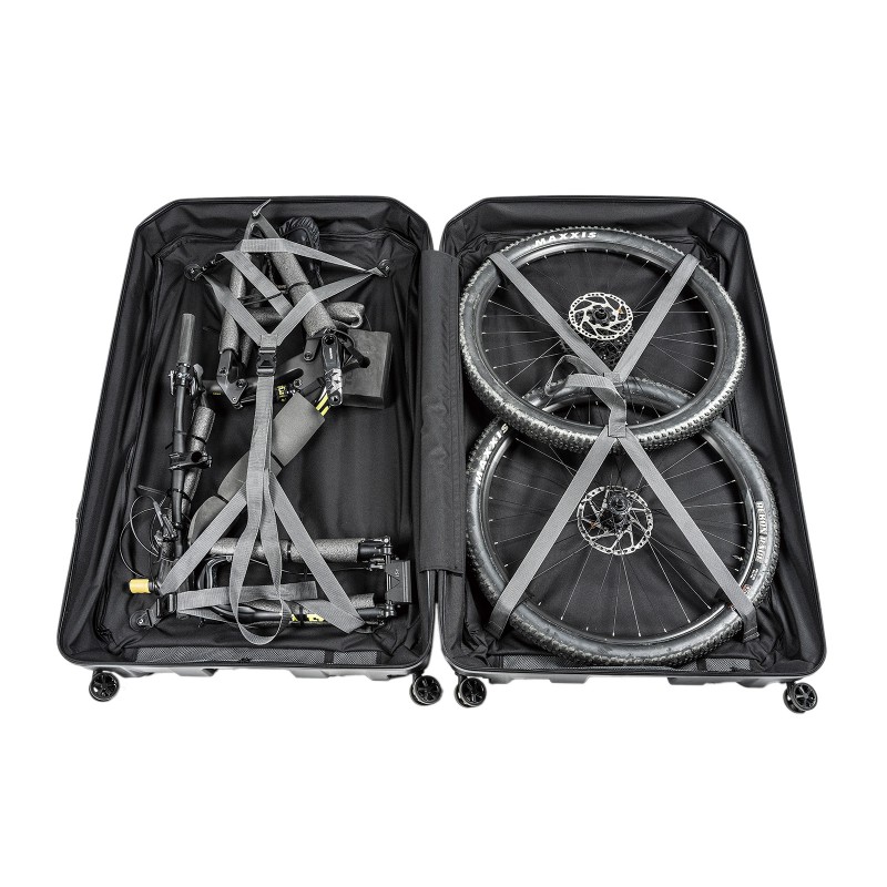 其它:直立式箱體設計,便利攜行,搭配多功能提把與四顆 60mm 大型萬向輪,提供順暢移動體驗,無論機場、車站或城市街道,都能輕鬆拖行。內部設有收納口袋,方便整理配件,並附傳動系統保護套與車架管、前叉防護套,確保運輸過程中愛車的每個細節都受到妥善保護。
